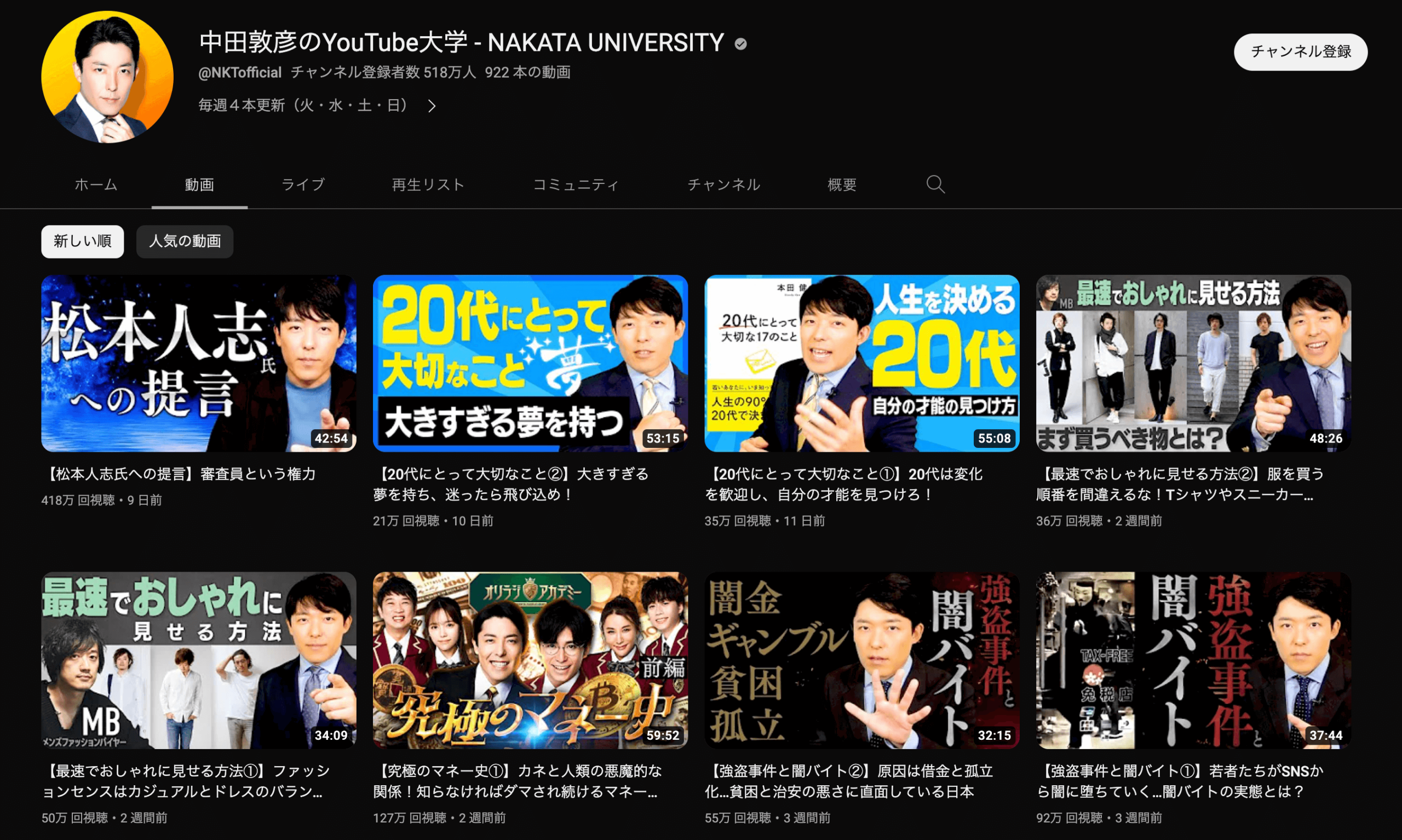 YouTubeチャンネルは、投稿した動画のサムネイルが添付画像のように一覧で表示される仕様になっています。